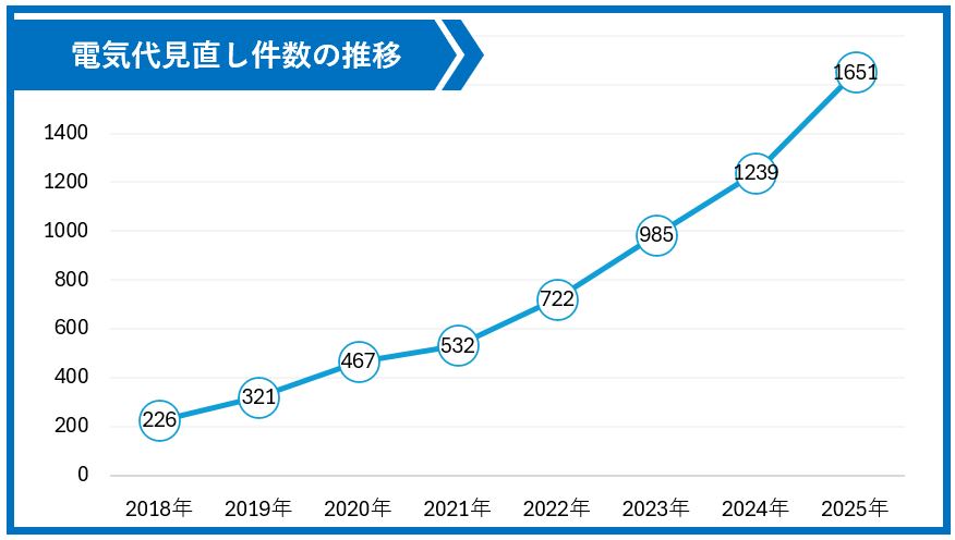 この実績は、大手電力の標準メニューを利用している企業だけでなく、すでに新電力と契約している企業も含めた数字です。